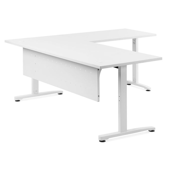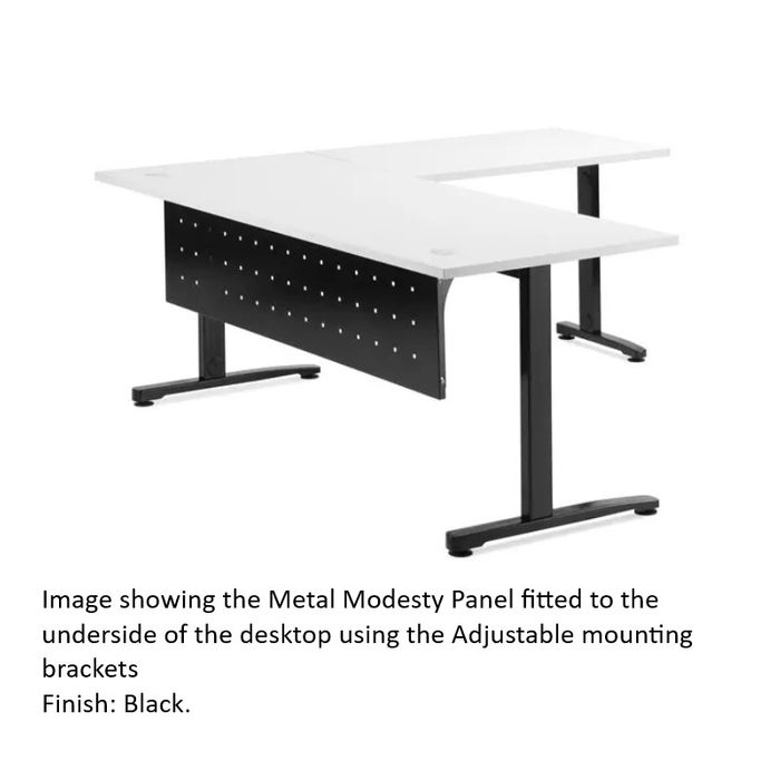 This perforated under-desk steel modesty panel is 350mm high and available in White or Black. The modesty comes with colour matching, hanging brackets, providing a refined look with a slight gap between the top of the panel and the underside of the desk.