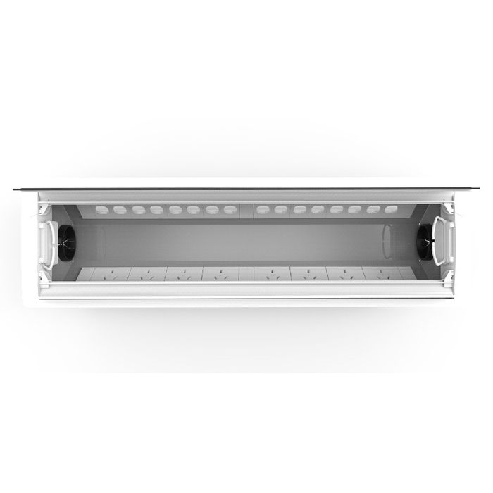 Appliance cables exit through scalloped sides or through the centre brushed-strip