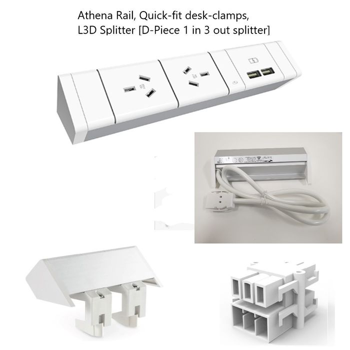 c/w 2 x Quick-fit desk clamps to secure the power rail to back edge of desktop.