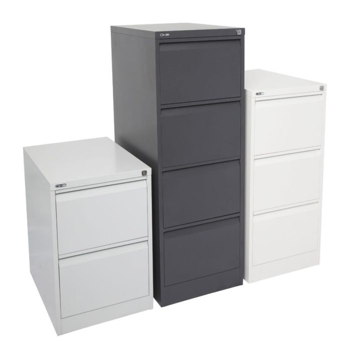 The Go filing cabinet range is built to last with a riveted construction, anti tilt locking and heavy duty ball bearing runners.