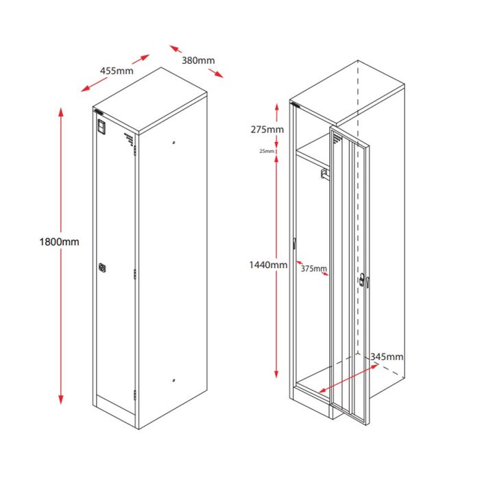 GO lockers are built to last with a fully riveted construction and full length stiffeners fitted to every door for additional security. The single door locker is fitted with a hat shelf and coat rail and is backed by a 10 year warranty.
