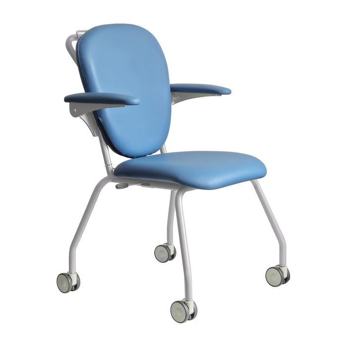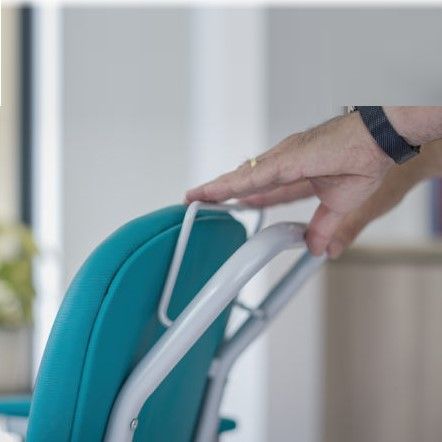 A mobile dining chair with dual controls specifically tailored for User or Carer, fitted with locking castors to ensure the chair remains in a secure location that’s coupled with an easy release control for moving. Suitable for extended seating with lift-up arms for side entry/exit.
