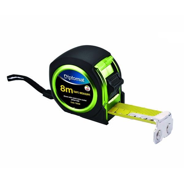 8 metre tape measure with full rubber grip, 25mm wide, nylon coated, yellow metal tape.