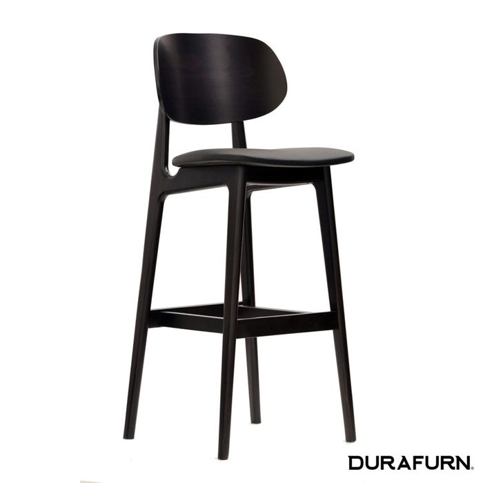 The Duraseat Ban Barstool with Vinyl Seat is manufactured using a solid European beech wood frame sourced in Germany. It is a chair designed to withstand commercial use in hospitality or similar applications.