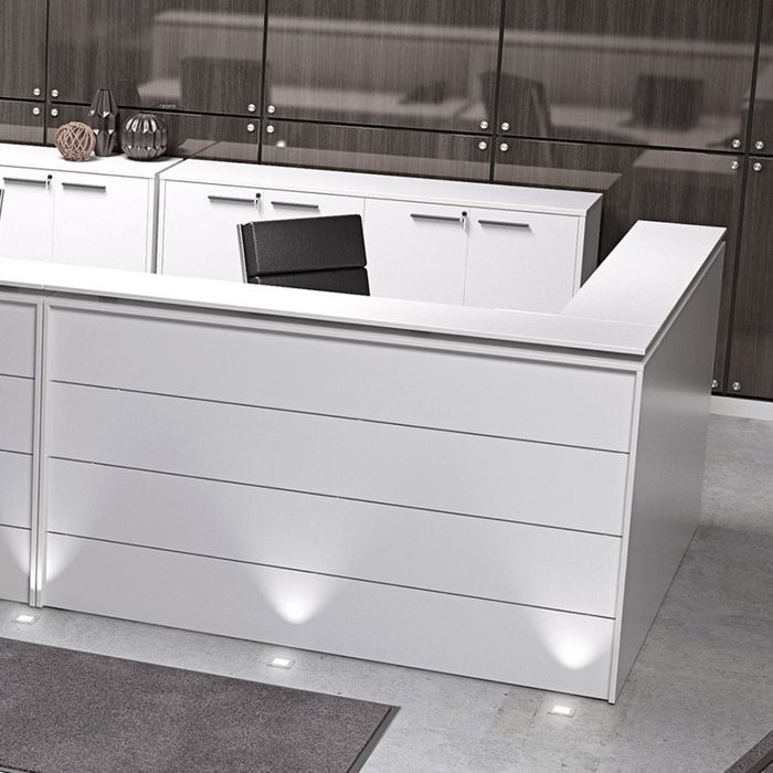 The Axis Corner Reception Counter combines the Axis Reception Corner Facade and the Axis 90° Degree Corner Workstation.