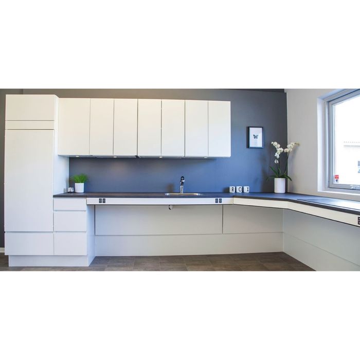 Flexi Electric Sit to Stand Bench allows a bench section to be Sit to Stand to seamlessly integrate into a pre-existing kitchen due the design able to conceal the legs if required.