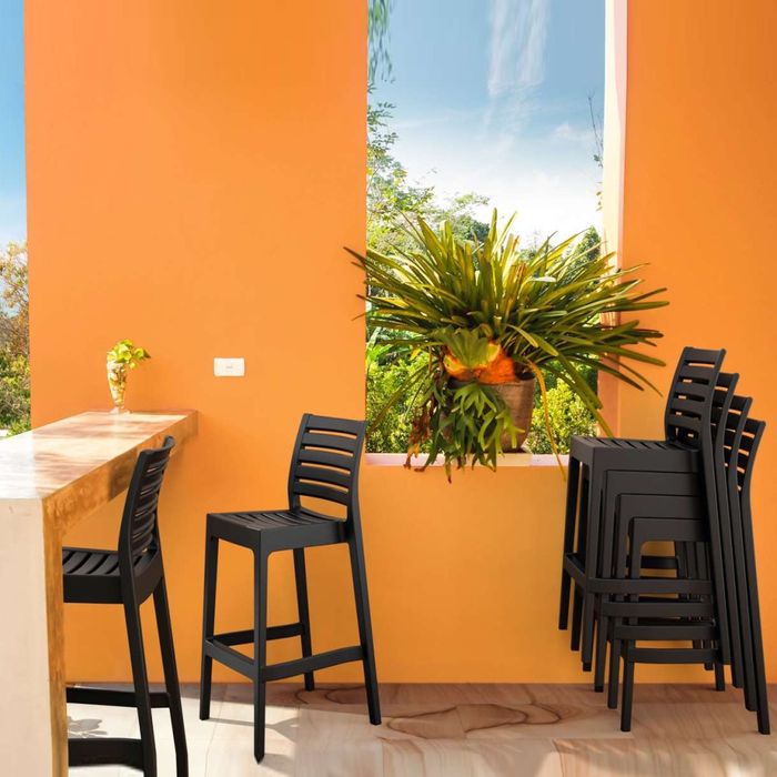 The Ares Barstool by Siesta is no ordinary plastic Stool. It’s extraordinary strength is due to the entire stool being one-piece injection moulded polypropylene, the legs reinforced with glass fibre for even more stability. The plastic is packed with UV stabiliser, so this stool will not fade or go brittle even in the sunniest weather conditions. Siesta’s Ares Barstool is built to last in busy commercial venues, indoor or outdoor.