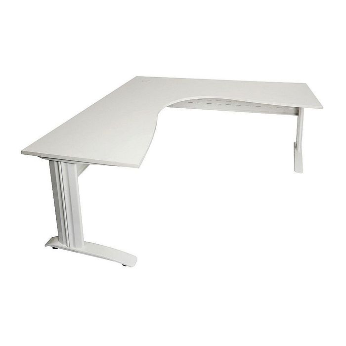 The corner workstations come with an E0 one piece top with cable tidy, perforated metal modesty panel and adjustable feet.